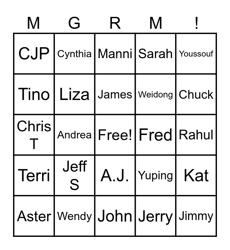 This bingo card has a free space and 41 words: David, Chris T, Yixuan, Liza, Wendy, A.J., James, Paul, Youssouf, Terri, Andrea, Sarah, Jimmy, Rahul, Fred, Jeff S, Nini, CJP, Ishie, Manni, Kat, Mike, John, Weidong, Klara, Jackie, Jerry, Vic, Chuck, Marion, Kay, Cynthia, Aster, Jonas, Yuping, Tino, Gina, Eric, Danny, Sheila and Norma.