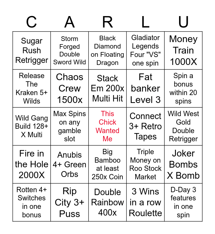 This bingo card has a free space and 24 words: Anubis 4+ Green Orbs, Rip City 3+ Puss, Stack Em 200x Multi Hit, Rotten 4+ Switches in one bonus, Money Train 1000X, Sugar Rush Retrigger, Release The Kraken 5+ Wilds, Storm Forged Double Sword Wild, Connect 3+ Retro Tapes, Big Bamboo at least 250x Coin, Fat banker Level 3, Wild Gang Build 128+ X Multi, Triple Money on Roo Stock Market, Joker Bombs X Bomb, Chaos Crew 1500x, 3 Wins in a row Roulette, Wild West Gold Double Retrigger, Black Diamond on Floating Dragon, Spin a bonus within 20 spins, Max Spins on any gamble slot, D-Day 3 features in one spin, Fire in the Hole 2000X, Gladiator Legends Four "VS" one spin and Double Rainbow 400x.
