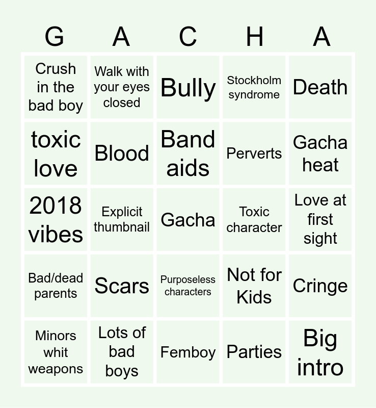 This bingo card has a free space and 85 words: Japanis uniforme, Eye patch, Bully, Fake friends, Powers, Animal ears and tail, Love triangle, Powers, Colored hair, Collar chokers, Bleed in 1 punch, Stutter, Blood, Toxic character, Horns, Crush in the bad boy, Minors whit weapons, toxic love, Hybrids, Colores hair, Bleed in 1 punch, Perverts, Big intro, Killers, Explicit thumbnail, Wings, Tongue kiss, Yuri/Yaoi, Bucket of water at the door, Maid costume, Scars, Inappropriat clothig at school, Knives (not for cooking), 2018 vibes, Spoiled blonde, Bad twin, Femboy, Edits, Bad/dead parents, Gacha heat, Crimes, Music box, Tomboy, watermark, Heterocromia, Teleportation Powers, Smoke the lollipops, Slow walk, Leaf in hair, Trauma, Walk with your eyes closed, Band aids, Sleeves too long, Alpha, Omegaverse, Boys with VERY long hair, Lots of bad boys, Stockholm syndrome, Psychopaths who are not psychopaths, Magic mark, Arranged marriage, Fall in love with a criminal, Abs, Depression, Car crash, Death, Try to make the character sexy, Cringe, Enemies to lovers, Weapons in school, Cheating, Girl kisses the protagonist's lover, Romanticized sexual harassment, Roommates, Emo, Purposeless characters, Parties, Romanticize criminals, Aggression, Trend, Love at first sight, Romanticize kidnapping, text too fast/slow, Not for Kids and wtf moments.