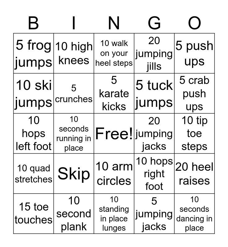 This bingo card has a free space and 24 words: Skip, 10 second plank, 5 karate kicks, 15 toe touches, 5 push ups, 5 frog jumps, 10 ski jumps, 10 high knees, 20 jumping jacks, 10 arm circles, 5 tuck jumps, 10 hops left foot, 10 hops right foot, 20 heel raises, 5 crunches, 5 jumping jacks, 10 tip toe steps, 10 walk on your heel steps, 5 crab push ups, 10 seconds running in place, 10 seconds dancing in place, 10 quad stretches, 20 jumping jills and 10 standing in place lunges.