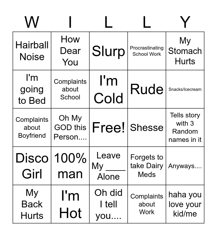 This bingo card has a free space and 24 words: 100% man, I'm Hot, I'm Cold, My Back Hurts, My Stomach Hurts, Hairball Noise, I'm going to Bed, How Dear You, Shesse, Leave My ____ Alone, Rude, Complaints about Boyfriend, Forgets to take Dairy Meds, Anyways...., Complaints about School, Complaints about Work, Tells story with 3 Random names in it, Slurp, Snacks/Icecream, Oh My GOD this Person...., haha you love your kid/me, Disco Girl, Procrastinating School Work and Oh did I tell you.....