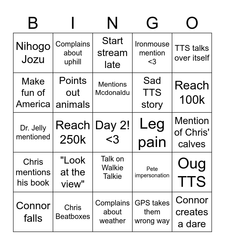 This bingo card has a free space and 24 words: "Look at the view", Chris Beatboxes, Mentions Mcdonaldu, Connor falls, TTS talks over itself, Nihogo Jozu, Make fun of America, Complains about uphill, Leg pain, Talk on Walkie Talkie, Sad TTS story, Dr. Jelly mentioned, Pete impersonation, Oug TTS, Points out animals, GPS takes them wrong way, Mention of Chris' calves, Start stream late, Reach 100k, Reach 250k, Connor creates a dare, Chris mentions his book, Ironmouse mention <3 and Complains about weather.