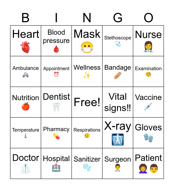 This bingo card has a free space and 24 words: Pharmacy 💊, Hospital🏥, Wellness ✨, Doctor🥼, Nurse 👩⚕️, Heart🫀, Ambulance🚑, Blood pressure🩸, Vital signs‼️, Respirations 😮💨, Bandage🩹, Nutrition🍎, X-ray🩻, Gloves🧤, Appointment ⏰, Surgeon 👨⚕️, Vaccine💉, Mask😷, Examination🧐, Dentist🦷, Patient👩🦱👨, Temperature🌡️, Stethoscope 🩺 and Sanitizer🫧.