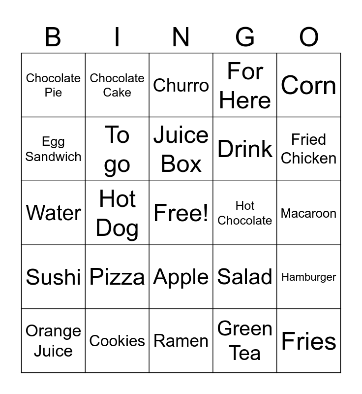 This bingo card has a free space and 25 words: Pizza, Ramen, Juice Box, Orange Juice, Corn, Chocolate Pie, Egg Sandwich, Chocolate Cake, Hot Chocolate, Apple, Drink, Water, Salad, Hamburger, To go, Milk, Macaroon, Churro, Fried Chicken, Hot Dog, Fries, Cookies, Sushi, For Here and Green Tea.