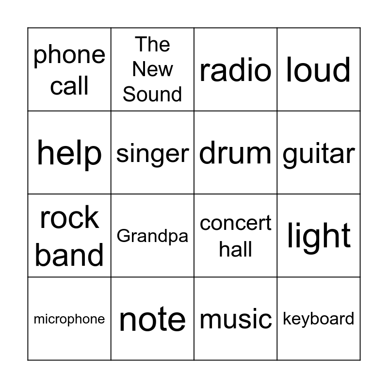 This bingo card has 40 words: computer screen, concert hall, crowd, drum, drummer, expensive, guitar, guitar player, help, keyboard, light, loud, microphone, music, note, office, orchestra, phone call, police officer, radio, record, ring / rang, rock band, singer, sound, speakers, stage, train station, violin, violin case, violin player, voice, Rosie, Ben, Grandpa, Alice, Aunt Emma, Clunk, The New Sound and Nick.