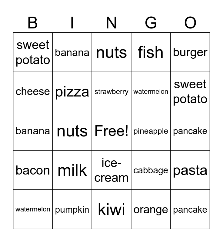 This bingo card has a free space and 48 words: cherry, pancake, green banana, kiwi, milk, bacon, banana, papaya, cheese, pumpkin, pizza, fish, pasta, cabbage, breadfruit, drumstick, strawberry, pineapple, ice-cream, burger, nuts, orange, sweet potato, watermelon, cherry, sweet potato, watermelon, chicken, ice-cream, bacon, pizza, fish, pasta, cabbage, pumpkin, milk, kiwi, pancake, cheese, breadfruit, strawberry, orange, nuts, papaya, banana, green banana, pineapple and burger.