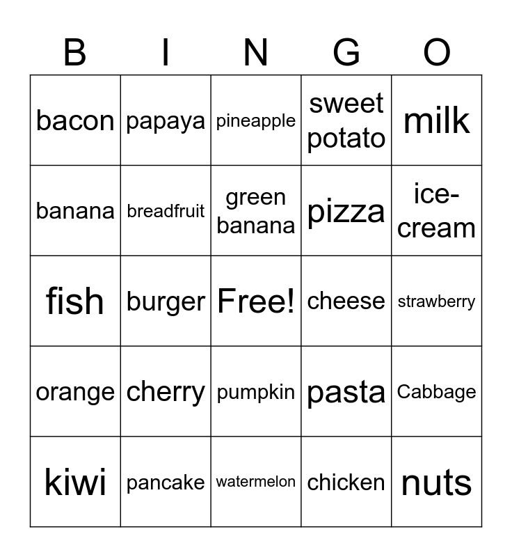This bingo card has a free space and 24 words: cherry, pancake, green banana, kiwi, milk, bacon, banana, papaya, cheese, pumpkin, pizza, fish, pasta, Cabbage, breadfruit, chicken, strawberry, pineapple, ice-cream, burger, nuts, orange, sweet potato and watermelon.