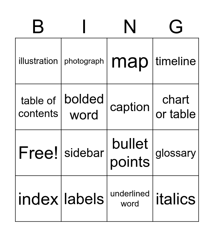 This bingo card has 20 words: glossary, heading, map, diagram, index, table of contents, labels, illustration, Free!, photograph, sidebar, bullet points, bolded word, italics, caption, subheading, chart or table, timeline, underlined word and title page.