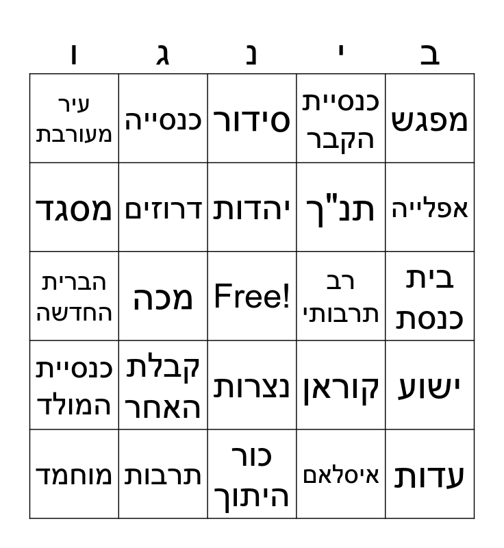 This bingo card has a free space and 26 words: נצרות, איסלאם, יהדות, תרבות, מפגש, עיר מעורבת, מסגד, כנסייה, בית כנסת, קוראן, תנ"ך, הברית החדשה, ישוע, מוחמד, מכה, הר הבית, כנסיית הקבר, כנסיית המולד, סידור, עדות, אפלייה, כור היתוך, רב תרבותי, קבלת האחר, דרוזים and באהים.