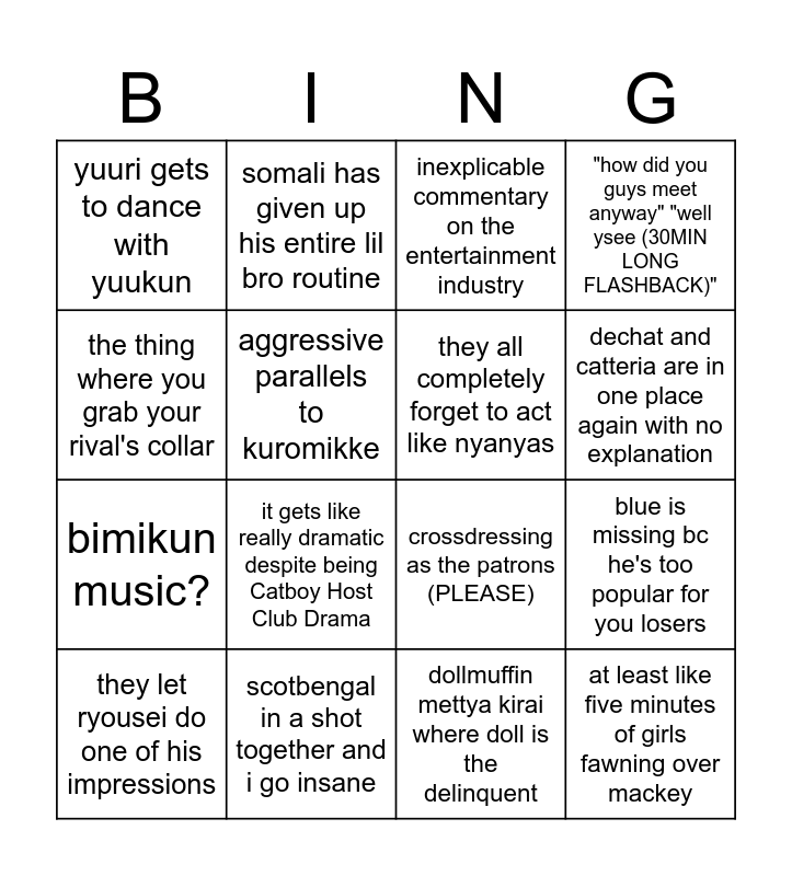 This bingo card has 16 words: scotbengal in a shot together and i go insane, blue is missing bc he's too popular for you losers, inexplicable commentary on the entertainment industry, yuuri gets to dance with yuukun, bimikun music?, somali has given up his entire lil bro routine, crossdressing as the patrons (PLEASE), dollmuffin mettya kirai where doll is the delinquent, the thing where you grab your rival's collar, aggressive parallels to kuromikke, they let ryousei do one of his impressions, "how did you guys meet anyway" "well ysee (30MIN LONG FLASHBACK)", it gets like really dramatic despite being Catboy Host Club Drama, dechat and catteria are in one place again with no explanation, they all completely forget to act like nyanyas and at least like five minutes of girls fawning over mackey.
