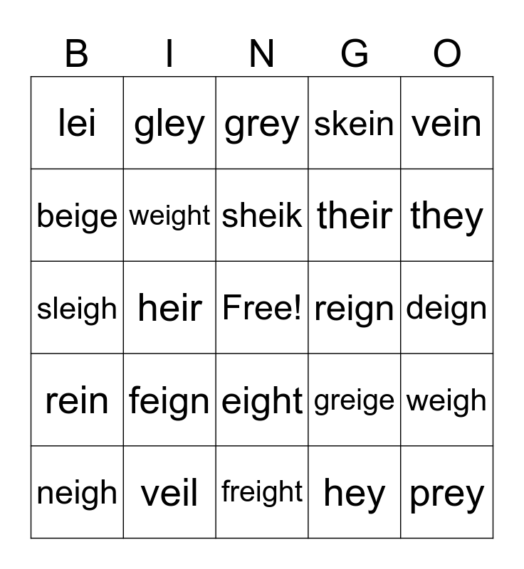 This bingo card has a free space and 24 words: feign, veil, sheik, neigh, vein, lei, beige, gley, reign, eight, their, sleigh, greige, weigh, weight, hey, deign, grey, they, heir, prey, rein, skein and freight.