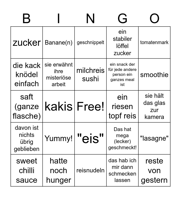 This bingo card has a free space and 24 words: Yummy!, hatte noch hunger, milchreis sushi, sweet chilli sauce, tomatenmark, zucker, die kack knödel einfach, Banane(n), ein riesen topf reis, "eis", ein snack der für jede andere person ein ganzes meal ist, saft (ganze flasche), Das hat mega (lecker) geschmeckt!, "lasagne", sie erwähnt ihre misteriöse arbeit, das hab ich mir dann schmecken lassen, sie hält das glas zur kamera, geschnippelt, smoothie, kakis, reste von gestern, davon ist nichts übrig geblieben, ein stabiler löffel zucker and reisnudeln.