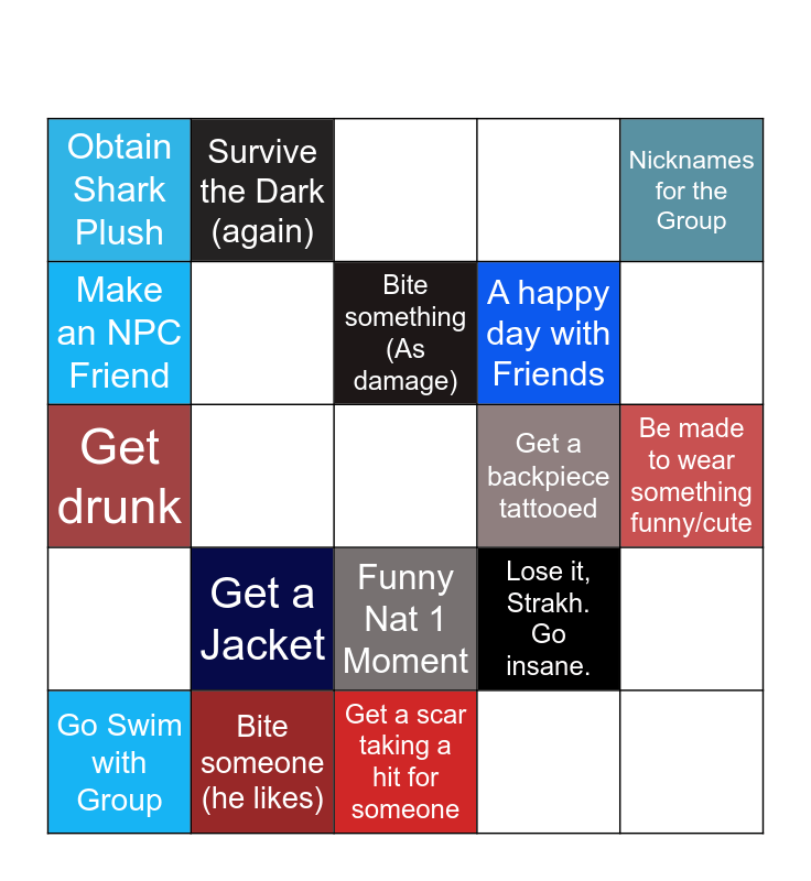 This bingo card has a free space and 24 words: Get a Jacket, Bite someone (he likes), Bite something (As damage), Go Swim with Group, Nicknames for the Group, Obtain Shark Plush, Make an NPC Friend, Survive the Dark (again), Get a backpiece tattooed, Funny Nat 1 Moment, A happy day with Friends, Get drunk, Lose it, Strakh. Go insane., Get a genuine hug, Find out what happened to Teddy, Find out what happened to Parents, Be made to wear something funny/cute, Carry Merry, Bro Bond with Grace unlocked, Have a genuine moment with Aeneas, Carry Alychge, Mafia #2 Moment, Strakh being a Yandere and Get a scar taking a hit for someone.