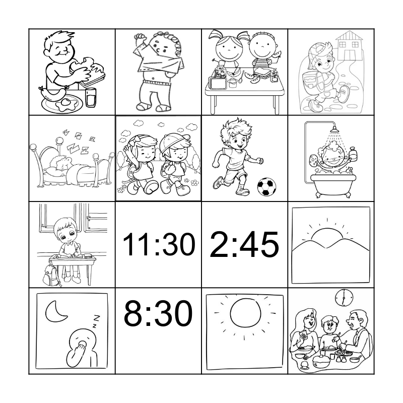 This bingo card has 17 images and 5 words: 8:30, 2:45, 4:30, 9:45 and 11:30.