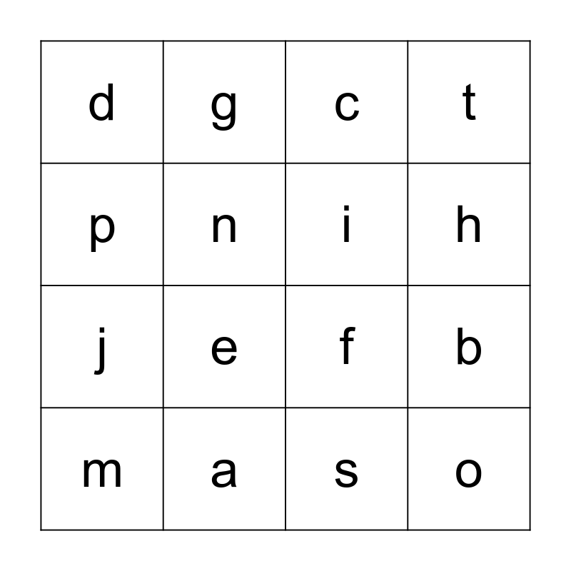 This bingo card has 16 words: a, b, c, d, j, g, f, s, p, n, m, t, e, h, i and o.