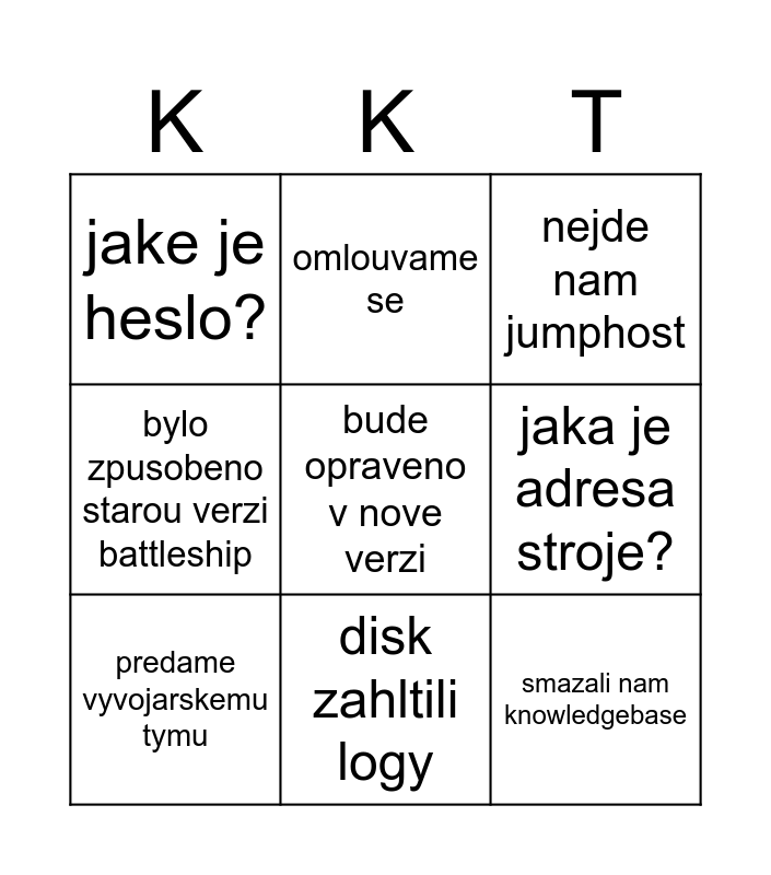 This bingo card has a free space and 8 words: jaka je adresa stroje?, nejde nam jumphost, omlouvame se, predame vyvojarskemu tymu, jake je heslo?, smazali nam knowledgebase, bylo zpusobeno starou verzi battleship and disk zahltili logy.