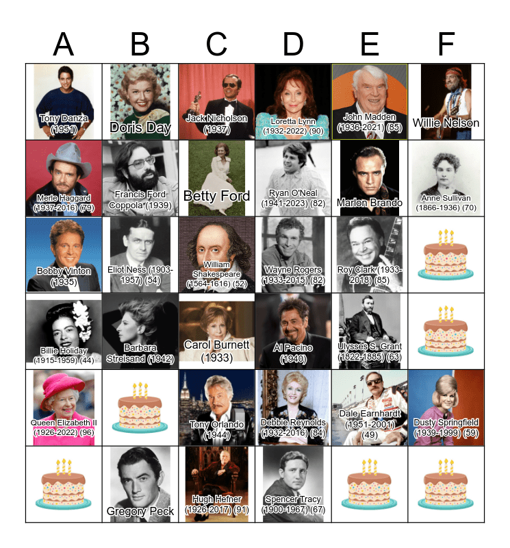 This bingo card has 36 images and 30 words: Debbie Reynolds (1932-2016) (84), Tony Orlando (1944), Spencer Tracy (1900-1967) (67), Merle Haggard (1937-2016) (79), Billie Holiday (1915-1959) (44), Wayne Rogers (1933-2015) (82), Francis Ford Coppola (1939), Hugh Hefner (1926-2017) (91), John Madden (1936-2021) (85), Dale Earnhardt (1951-2001) (49), Anne Sullivan (1866-1936) (70), Loretta Lynn (1932-2022) (90), Dusty Springfield (1939-1999) (59), Eliot Ness (1903-1957) (54), Ryan O'Neal (1941-2023) (82), Tony Danza (1951), Queen Elizabeth II (1926-2022) (96), Roy Clark (1933-2018) (85), Bobby Vinton (1935), Jack Nicholson (1937), William Shakespeare (1564-1616) (52), Barbara Streisand (1942), Al Pacino (1940), Carol Burnett (1933), Ulysses S. Grant (1822-1885) (63), Doris Day, Marlon Brando, Gregory Peck, Betty Ford and Willie Nelson.