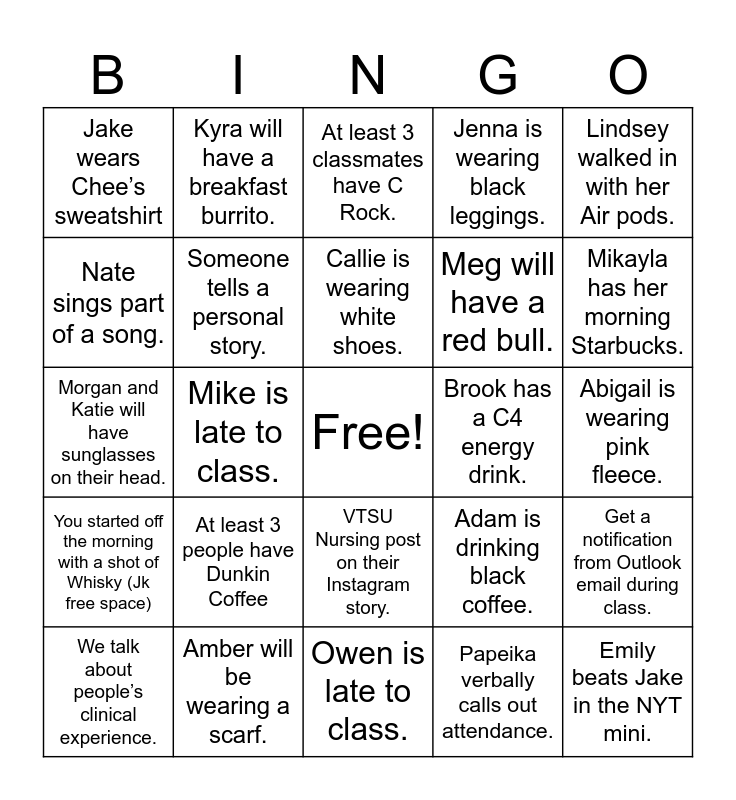 This bingo card has a free space and 31 words: Owen is late to class., Ben is late to class., Mike is late to class., Mo will interrupt class., Jake wears Chee’s sweatshirt, At least 3 classmates have C Rock., Someone tells a personal story., Adam is drinking black coffee., Brook has a C4 energy drink., Papeika verbally calls out attendance., Abigail is wearing pink fleece., Emily beats Jake in the NYT mini., Someone is absent from class., Dr. Papeika dismisses class early (even by a minute), Mikayla has her morning Starbucks., Mo whistles to get the class’s attention., Get a notification from Outlook email during class., At least 3 people have Dunkin Coffee, You started off the morning with a shot of Whisky (Jk free space), VTSU Nursing post on their Instagram story., Lindsey walked in with her Air pods., Pam will be wearing Lululemon., We talk about people’s clinical experience., Kyra will have a breakfast burrito., Meg will have a red bull., Nate sings part of a song., Jenna is wearing black leggings., Morgan and Katie will have sunglasses on their head., Amber will be wearing a scarf., Callie is wearing white shoes. and Dr. Papieka says good morning..