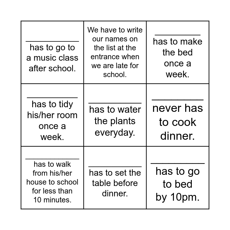 This bingo card has 9 words: _____________ has to walk from his/her house to school for less than 10 minutes., __________ has to water the plants everyday., _________ has to make the bed once a week., ___________ has to go to a music class after school., We have to write our names on the list at the entrance when we are late for school., ________ never has to cook dinner., __________ has to tidy his/her room once a week., ___________ has to set the table before dinner. and _________ has to go to bed by 10pm..