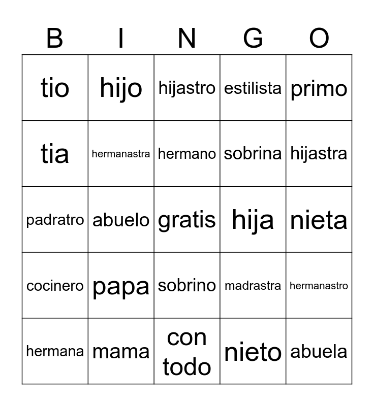 This bingo card has a free space and 24 words: papa, mama, hermano, hermana, primo, tio, tia, hijo, hija, sobrino, sobrina, padratro, madrastra, hermanastro, hermanastra, nieto, nieta, hijastro, hijastra, abuelo, abuela, cocinero, estilista and con todo.