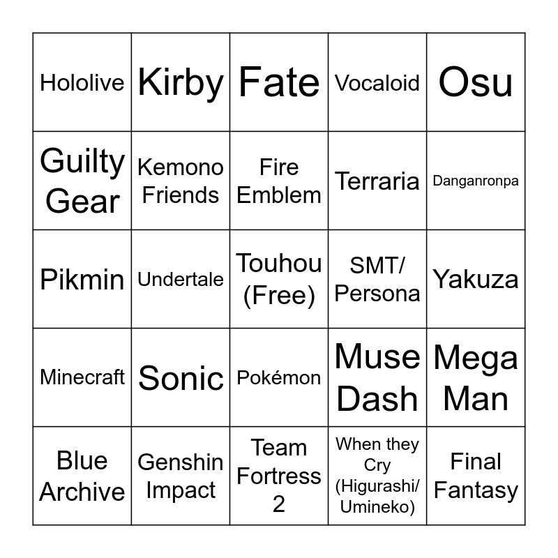This bingo card has a free space and 24 words: Sonic, Genshin Impact, Fire Emblem, Blue Archive, Osu, Hololive, Guilty Gear, Kirby, SMT/ Persona, Pokémon, Terraria, Pikmin, Muse Dash, Mega Man, Kemono Friends, When they Cry (Higurashi/ Umineko), Yakuza, Fate, Danganronpa, Undertale, Final Fantasy, Minecraft, Vocaloid and Team Fortress 2.