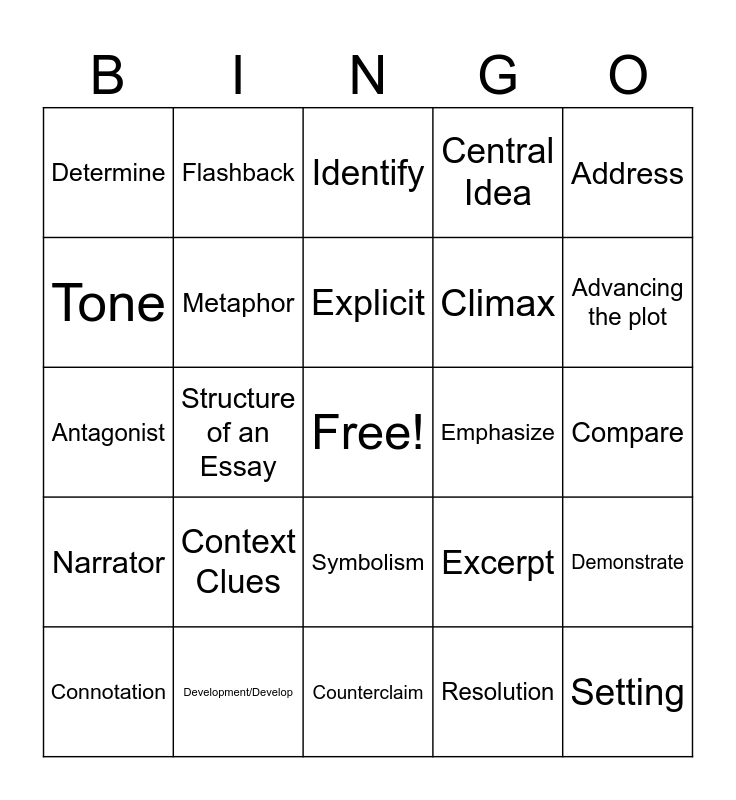This bingo card has a free space and 69 words: Suggest, Compare, Characterize, Summarize, Development/Develop, Point-Of-View, Central Idea, Theme, Address, Contrast, Demonstrate, Infer/Inference, Determine, Identify, Thesis, Structure of an Essay, Symbolism, Climax, Expresses the theme, Narrator, Emphasize, Excerpt, Advancing the plot, Figurative Language, Evaluate, Argument, Refine, Rising Action, Resolution, Foreshadowing, Flashback, Support, Imply, As it is used in the sentence/paragraph, Rhetoric, Tension, Allusion, Claim, Tone, Transition, Context Clues, Setting, Convey, Structure, Objective Summary, Connotation, Denotation, Mood, Simile, Metaphor, Explicit, Implicit, Plot, Counterclaim, Credible, Bias, Biography, Autobiography, Protagonist, Antagonist, Explanatory, Narrative, Argumentative, Credibility, Persuasive, Ethos, Pathos, Logos and Irony (Dramatic, Verbal, Situational).