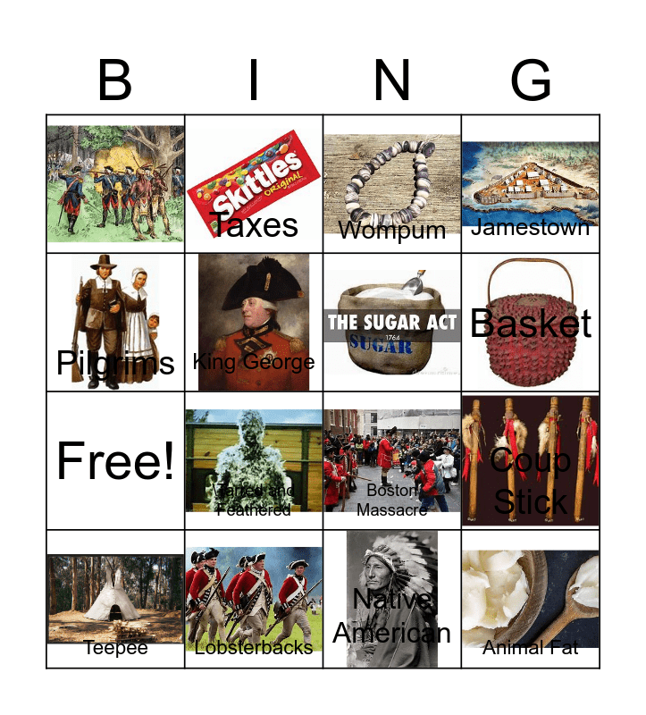 This bingo card has 19 images and 18 words: Coup Stick, Quill Feather, Wompum, Chamber Pot, Teepee, Pilgrims, Lobsterbacks, Free!, Taxes, \Tarred and Feathered, Boston Massacre, King George, Animal Fat, Tea Act, Basket, Jamestown, Native American and Christopher Columbus.