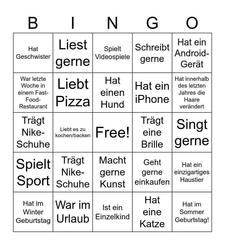 This bingo card has a free space and 24 words: Trägt Nike-Schuhe, War im Urlaub, Hat einen Hund, Hat im Winter Geburtstag, Hat ein Android-Gerät, Hat Geschwister, War letzte Woche in einem Fast-Food-Restaurant, Liest gerne, Trägt eine Brille, Macht gerne Kunst, Hat ein iPhone, Trägt Nike-Schuhe, Geht gerne einkaufen, Hat ein einzigartiges Haustier, Liebt Pizza, Hat eine Katze, Singt gerne, Spielt Videospiele, Hat innerhalb des letzten Jahres die Haare verändert, Liebt es zu kochen/backen, Hat im Sommer Geburtstag!, Spielt Sport, Schreibt gerne and Ist ein Einzelkind.