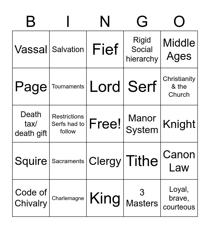 This bingo card has a free space and 24 words: Sacraments, Charlemagne, Lord, Code of Chivalry, Middle Ages, Vassal, Page, Salvation, Manor System, Clergy, Serf, Death tax/ death gift, Tithe, Canon Law, Tournaments, 3 Masters, Knight, Fief, Christianity & the Church, Restrictions Serfs had to follow, Loyal, brave, courteous, Squire, Rigid Social hierarchy and King.