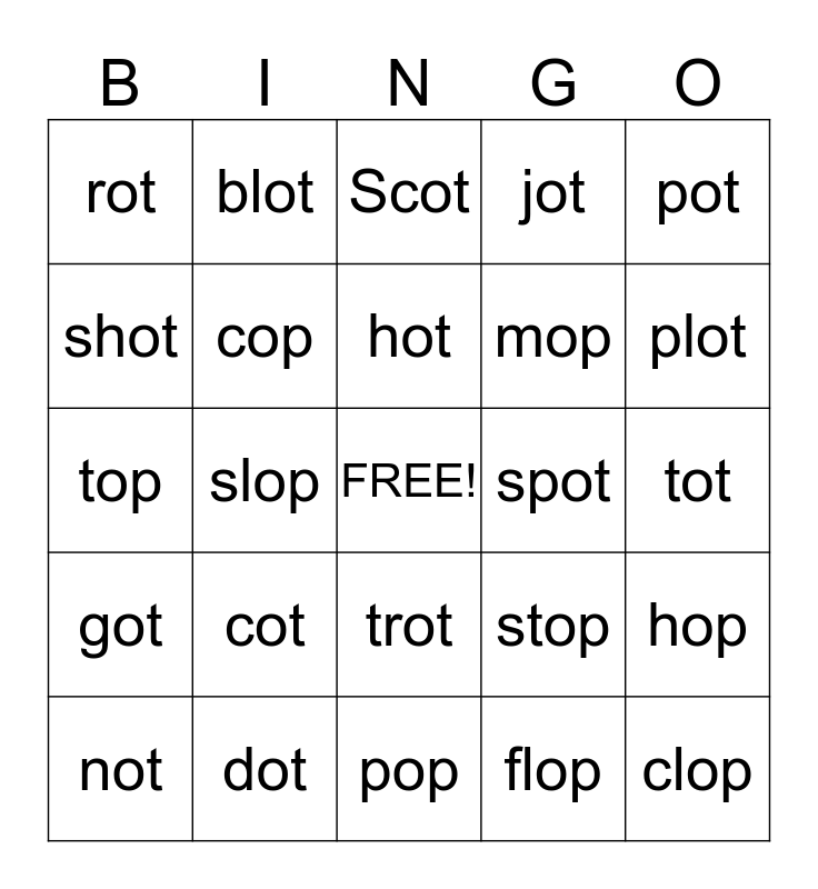 This bingo card has a free space and 24 words: cot, dot, hot, not, pot, rot, shot, blot, spot, trot, mop, top, stop, hop, cop, flop, tot, Scot, plot, slop, clop, got, jot and pop.