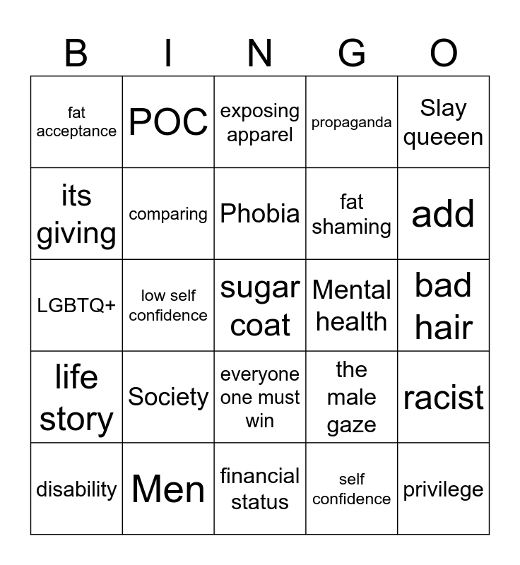 This bingo card has a free space and 24 words: Society, Men, Phobia, disability, Slay queeen, fat acceptance, its giving, POC, Mental health, everyone one must win, fat shaming, LGBTQ+, the male gaze, racist, comparing, self confidence, bad hair, exposing apparel, add, low self confidence, privilege, life story, propaganda and financial status.