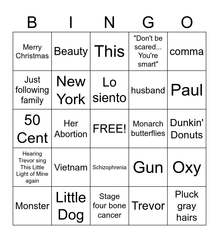 This bingo card has a free space and 24 words: Vietnam, Little Dog, Lo siento, Monster, comma, Merry Christmas, Just following family, Beauty, Monarch butterflies, Schizophrenia, husband, 50 Cent, Gun, Oxy, New York, Trevor, Dunkin' Donuts, This, Paul, Her Abortion, Pluck gray hairs, Hearing Trevor sing This Little Light of Mine again, "Don't be scared... You're smart" and Stage four bone cancer.