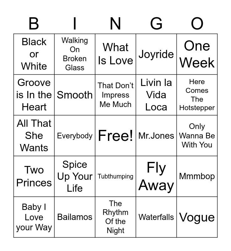 This bingo card has a free space and 63 words: California Love, I want It That Way, Life is A Highway, Mmmbop, Gonna Make You Sweat, Mambo No.5, Walking On Broken Glass, How Bizarre, That Don’t Impress Me Much, Hold on, Tubthumping, Cotton Eye Joe, Only Wanna Be With You, One Week, Miami, Groove is In the Heart, Everybody, Black or White, This Kiss, Livin la Vida Loca, Spice Up Your Life, Two Princes, Joyride, Finally, Macarena, The Sign, All I Wanna Do, Ill Be there for you, Breakfast At Tiffanys, Return Of The Mack, Ice Ice Baby, Semi Charmed Life, Walking In Memphis, Jump Around, Here Comes The Hotstepper, Baby I Love your Way, All Star, Waterfalls, Step By Step, Smooth, All That She Wants, Mr.Jones, I Can’t Dance, It Wasn't Me, Vogue, Bailamos, 3Am, Fly Away, Barbie Girl, Men In Black, Closing Time, The Rhythm Of the Night, Sweet Dreams, Boombastic, Whoomp There it is, What Is Love, Say My name, Doo Wop, Bye bye Bye, Run - Around, Chattahoochee, Killing me softly with his song and Be Me Lover.