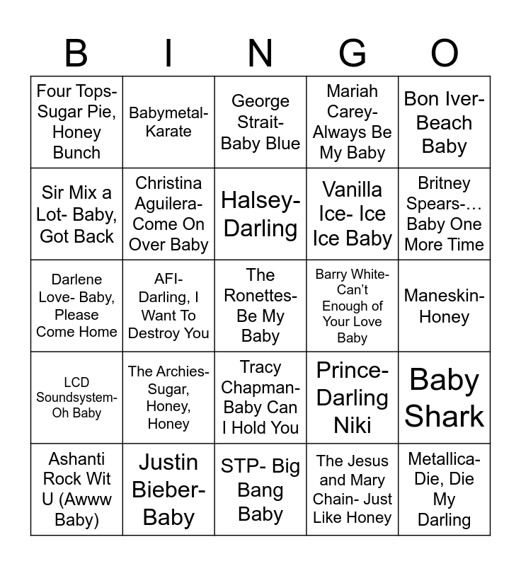 This bingo card has 27 words: Prince- Darling Niki, Metallica- Die, Die My Darling, Vanilla Ice- Ice Ice Baby, STP- Big Bang Baby, Sir Mix a Lot- Baby, Got Back, George Strait- Baby Blue, Babymetal- Karate, LCD Soundsystem- Oh Baby, Barry White- Can’t Enough of Your Love Baby, Baby Shark, Darlene Love- Baby, Please Come Home, Mariah Carey- Always Be My Baby, Ashanti Rock Wit U (Awww Baby), Justin Bieber- Baby, Britney Spears-…Baby One More Time, TLC- Baby, Baby, Baby, Christina Aguilera- Come On Over Baby, Halsey- Darling, The Archies- Sugar, Honey, Honey, Four Tops- Sugar Pie, Honey Bunch, Maneskin- Honey, The Jesus and Mary Chain- Just Like Honey, AFI- Darling, I Want To Destroy You, The Ronettes- Be My Baby, Tracy Chapman- Baby Can I Hold You, Bon Iver- Beach Baby and Bruno Mars- Runaway Baby.