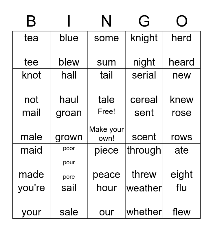 This bingo card has a free space and 24 words: poor pour pore, sail sale, tail tale, you're your, herd heard, tea tee, knot not, blue blew, sent scent, piece peace, serial cereal, mail male, through threw, ate eight, hall haul, weather whether, rose rows, some sum, new knew, groan grown, flu flew, maid made, knight night and hour our.