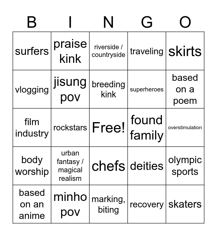 This bingo card has a free space and 24 words: urban fantasy / magical realism, minho pov, breeding kink, based on an anime, skirts, surfers, vlogging, praise kink, found family, chefs, superheroes, film industry, deities, olympic sports, jisung pov, recovery, overstimulation, riverside / countryside, based on a poem, rockstars, skaters, body worship, traveling and marking, biting.
