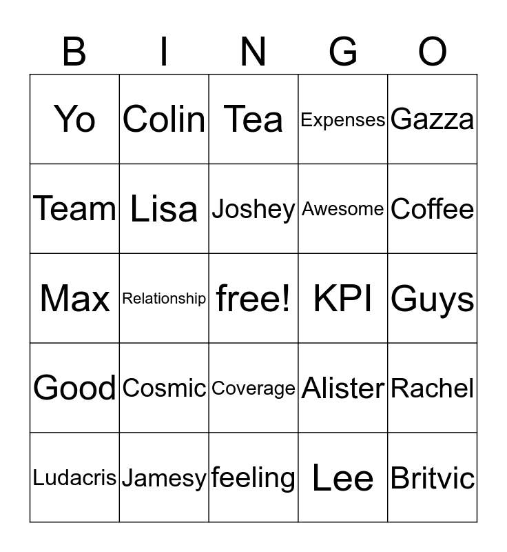 This bingo card has a free space and 24 words: Cosmic, Jamesy, Joshey, Ludacris, Gazza, Yo, Team, Colin, KPI, Coverage, Awesome, Max, Alister, Rachel, Lisa, Lee, Guys, Tea, Coffee, Relationship, Britvic, Good, Expenses and feeling.