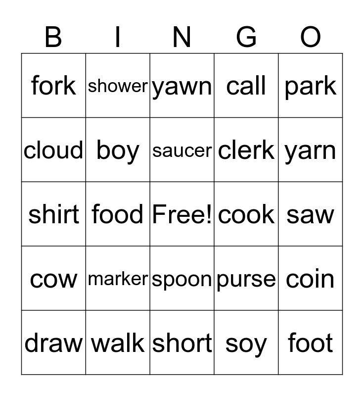 This bingo card has a free space and 24 words: marker, walk, saucer, draw, park, fork, cloud, shower, cook, spoon, clerk, shirt, purse, coin, boy, soy, saw, yawn, yarn, food, foot, cow, call and short.
