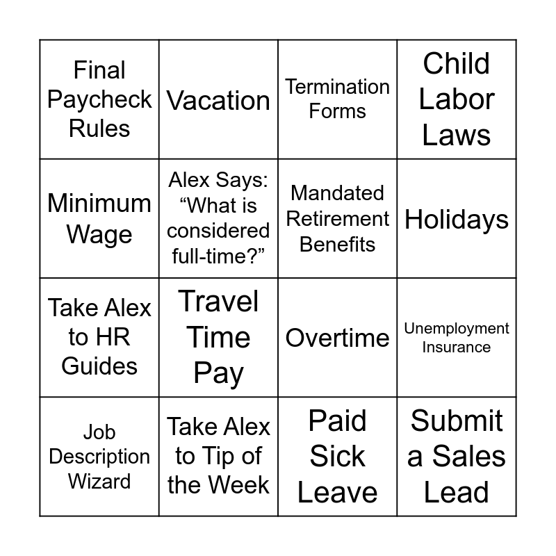 This bingo card has 46 words: Hiring Best Practices, Job Description Wizard, ACA, Disciplinary Action, Attendance Concerns, Sexual Harassment Prevention Training, Vacation, EEO, Alex Says: “What is considered full-time?”, Background Checks & Drug Testing, Mandated Retirement Benefits, Child Labor Laws, Pregnancy Leave, Recordkeeping, COBRA, Jury Duty Leave, Holidays, Take Alex to Tip of the Week, Deductions from Pay, Minimum Wage, Unemployment Insurance, Take Alex to BLR, Final Paycheck Rules, Take Alex to HR Guides, Worker’s Comp, Travel Time Pay, FMLA, I-9 Form or E-Verify, ZipRecruiter/CareerPlug, Submit a Sales Lead, Meal/Rest Breaks, Alex Says: “Where can I find my handbook?”, Guide Alex to an Upnetic Service, Alex’s first time using Handbook feature, RLC, Employee vs Contractor, Paid Sick Leave, FLSA Exemptions, ADA, Made a Personal Connection with Alex, COVID-19, Termination Forms, Overtime, Investigation, Alex Says: “It isn’t a good fit” and LMS Training Setup.