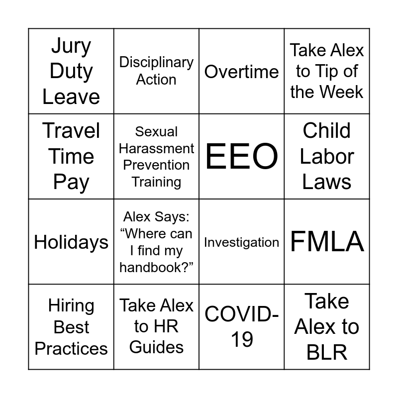 This bingo card has 47 words: Alex Says: “What is considered full-time?”, Hiring Best Practices, Job Description Wizard, ACA, Pregnancy Leave, Recordkeeping, Disciplinary Action, Attendance Concerns, Sexual Harassment Prevention Training, Vacation, EEO, Take Alex to Tip of the Week, Deductions from Pay, Minimum Wage, Background Checks & Drug Testing, Mandated Retirement Benefits, Child Labor Laws, Take Alex to HR Guides, Worker’s Comp, Travel Time Pay, FMLA, COBRA, Jury Duty Leave, Holidays, Meal/Rest Breaks, Alex Says: “Where can I find my handbook?”, Guide Alex to an Upnetic Service, Doc Vault, Unemployment Insurance, Take Alex to BLR, Final Paycheck Rules, Employee vs Contractor, Paid Sick Leave, FLSA Exemptions, ADA, Made a Personal Connection with Alex, COVID-19, I-9 Form or E-Verify, ZipRecruiter/CareerPlug, Submit a Sales Lead, Termination Forms, Overtime, Investigation, Alex Says: “It isn’t a good fit”, LMS Training Setup, Alex’s first time using Handbook feature and RLC.