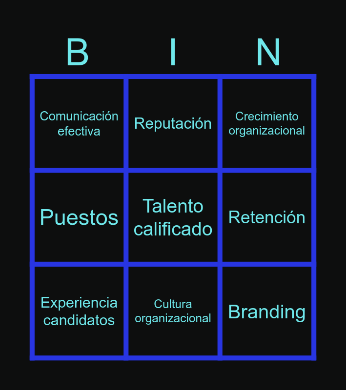 This bingo card has 12 words: Mejora continua, Branding, Talento calificado, Retención, Reputación, Crecimiento organizacional, Cultura organizacional, Valores, Comunicación efectiva, Puestos, Experiencia candidatos and Feedback.