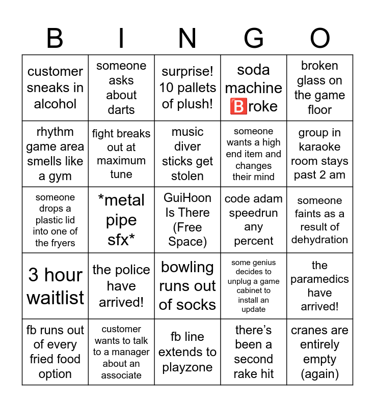 This bingo card has a free space and 24 words: the police have arrived!, customer wants to talk to a manager about an associate, music diver sticks get stolen, fb runs out of every fried food option, broken glass on the game floor, customer sneaks in alcohol, rhythm game area smells like a gym, someone asks about darts, code adam speedrun any percent, bowling runs out of socks, someone wants a high end item and changes their mind, someone drops a plastic lid into one of the fryers, some genius decides to unplug a game cabinet to install an update, the paramedics have arrived!, fight breaks out at maximum tune, there’s been a second rake hit, someone faints as a result of dehydration, surprise! 10 pallets of plush!, group in karaoke room stays past 2 am, *metal pipe sfx*, cranes are entirely empty (again), 3 hour waitlist, soda machine 🅱️roke and fb line extends to playzone.
