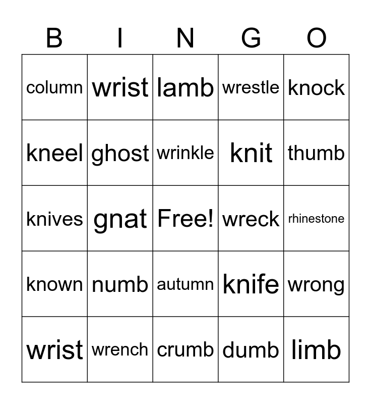 This bingo card has a free space and 29 words: wrist, rhyme, gnat, knife, column, lamb, ghost, numb, wreck, wrench, rhinestone, limb, crumb, dumb, thumb, plumber, autumn, known, knock, knives, knife, knee, knit, kneel, wrestle, wrist, wrong, wrinkle and wristband.