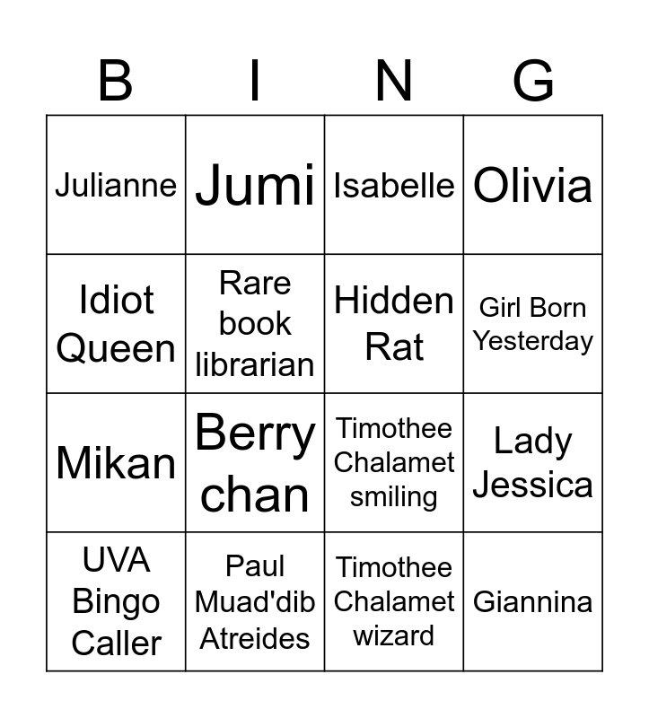 This bingo card has 16 words: Paul Muad'dib Atreides, Lady Jessica, Isabelle, Julianne, Mikan, Jumi, Timothee Chalamet smiling, Timothee Chalamet wizard, Idiot Queen, Rare book librarian, UVA Bingo Caller, Olivia, Berry chan, Girl Born Yesterday, Hidden Rat and Giannina.