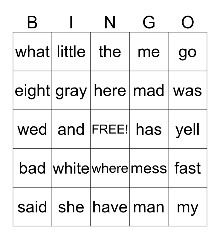 This bingo card has a free space and 24 words: white, she, here, said, go, what, eight, little, has, where, mad, wed, mess, fast, gray, man, yell, the, was, and, my, bad, me and have.
