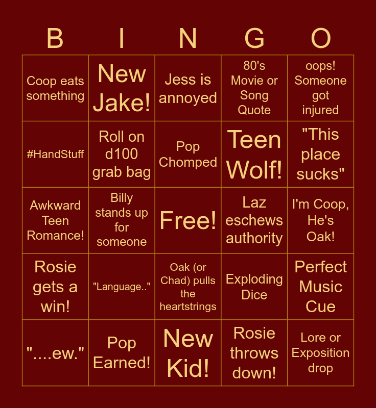 This bingo card has a free space and 24 words: "Language..", Pop Earned!, Pop Chomped, "....ew.", oops! Someone got injured, Coop eats something, #HandStuff, New Jake!, Laz eschews authority, Oak (or Chad) pulls the heartstrings, Teen Wolf!, Awkward Teen Romance!, Exploding Dice, Perfect Music Cue, Roll on d100 grab bag, Rosie throws down!, I'm Coop, He's Oak!, Jess is annoyed, "This place sucks", Billy stands up for someone, Lore or Exposition drop, Rosie gets a win!, 80's Movie or Song Quote and New Kid!.