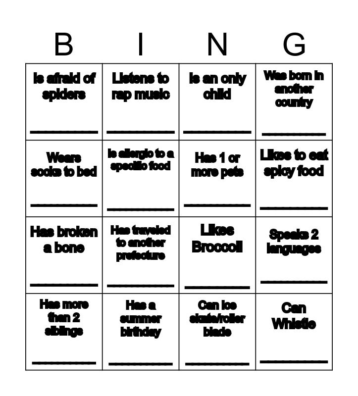 This bingo card has 17 words: Free!, Has more than 2 siblings __________, Listens to rap music _________, Is an only child _________, Speaks 2 languages __________, Wears socks to bed __________, Has traveled to another prefecture ___________, Has 1 or more pets __________, Likes to eat spicy food _________, Has broken a bone _________, Has a summer birthday __________, Likes Broccoli ________, Was born in another country __________, Is afraid of spiders _________, Is allergic to a specific food ___________, Can ice skate/roller blade __________ and Can Whistle _________.