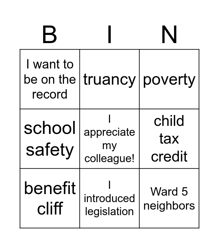 This bingo card has a free space and 8 words: child tax credit, poverty, truancy, benefit cliff, I want to be on the record, Ward 5 neighbors, school safety and I introduced legislation.