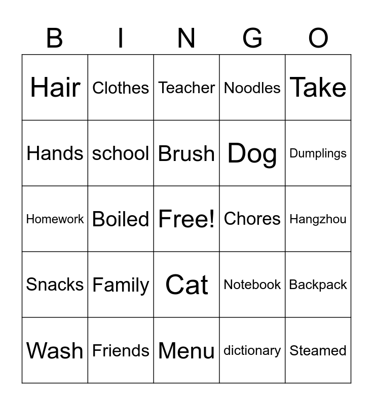 This bingo card has a free space and 24 words: Family, Friends, Brush, Wash, Take, Hair, Hands, Clothes, Chores, Cat, Dog, Homework, Notebook, Backpack, school, dictionary, Hangzhou, Teacher, Dumplings, Boiled, Steamed, Snacks, Noodles and Menu.