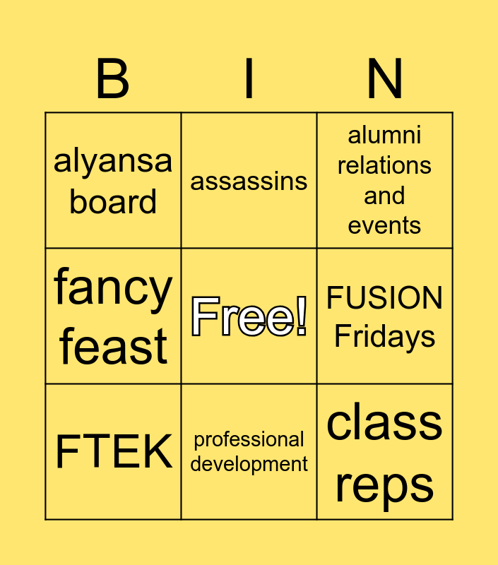 This bingo card has a free space and 10 words: division of career pathways, alumni relations and events, alyansa board, professional development, FUSION Fridays, FTEK, assassins, class reps, fancy feast and retreat.